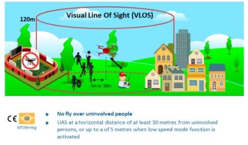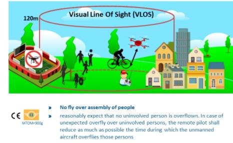 Distanță față de persoane: se menține o distanță de siguranță; este interzis survolul mulțimilor. În subcategoria A2 se păstrează minim 30 m sau 5 m cu modul de viteză redusă; în subcategoria A3, minim 150 m.