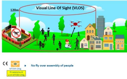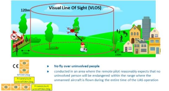 Altitudine maximă 120 m: drona nu trebuie să depășească 120 m de la cel mai apropiat punct al solului. Exceptări se pot acorda doar în baza unor autorizări speciale (categoria specific).